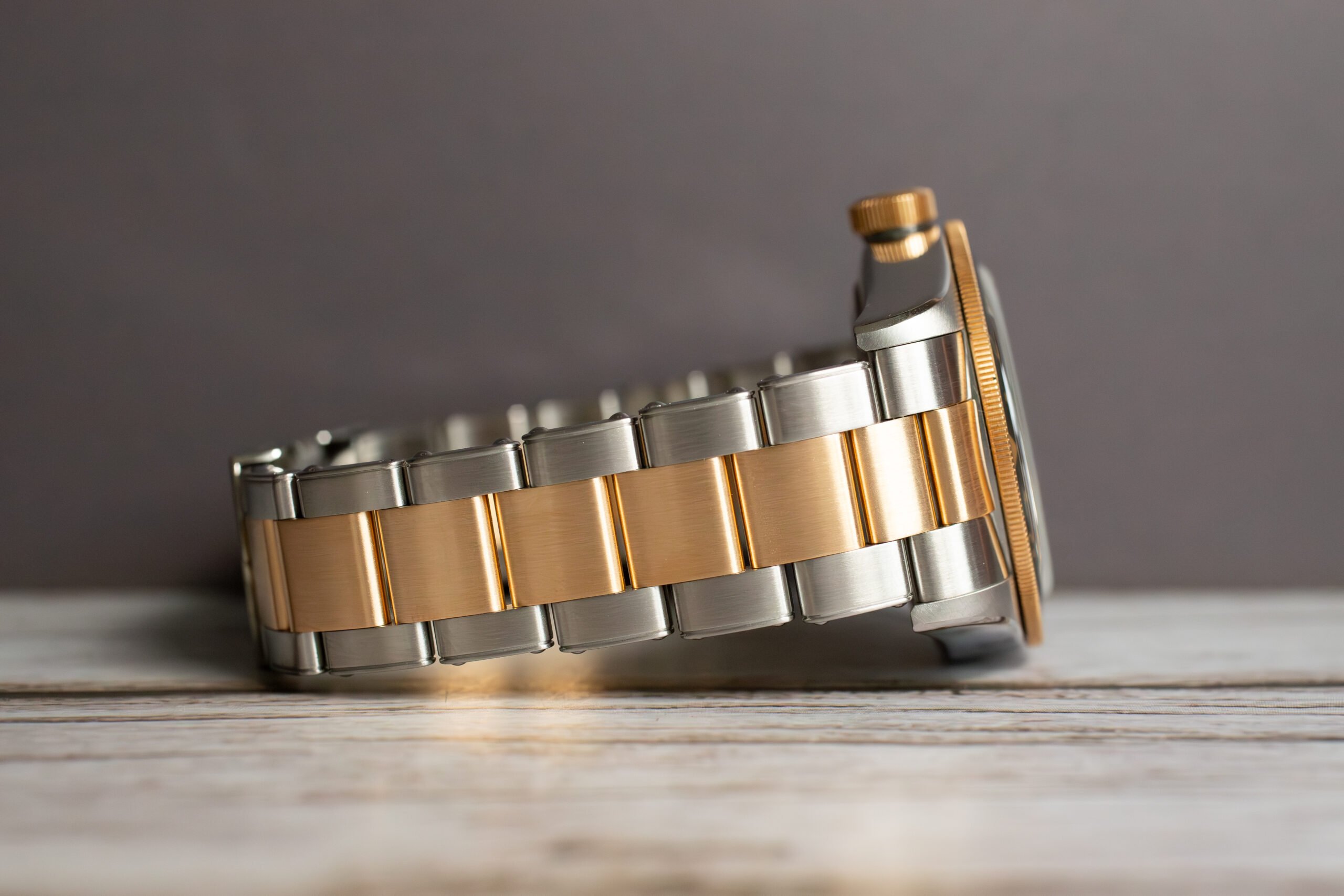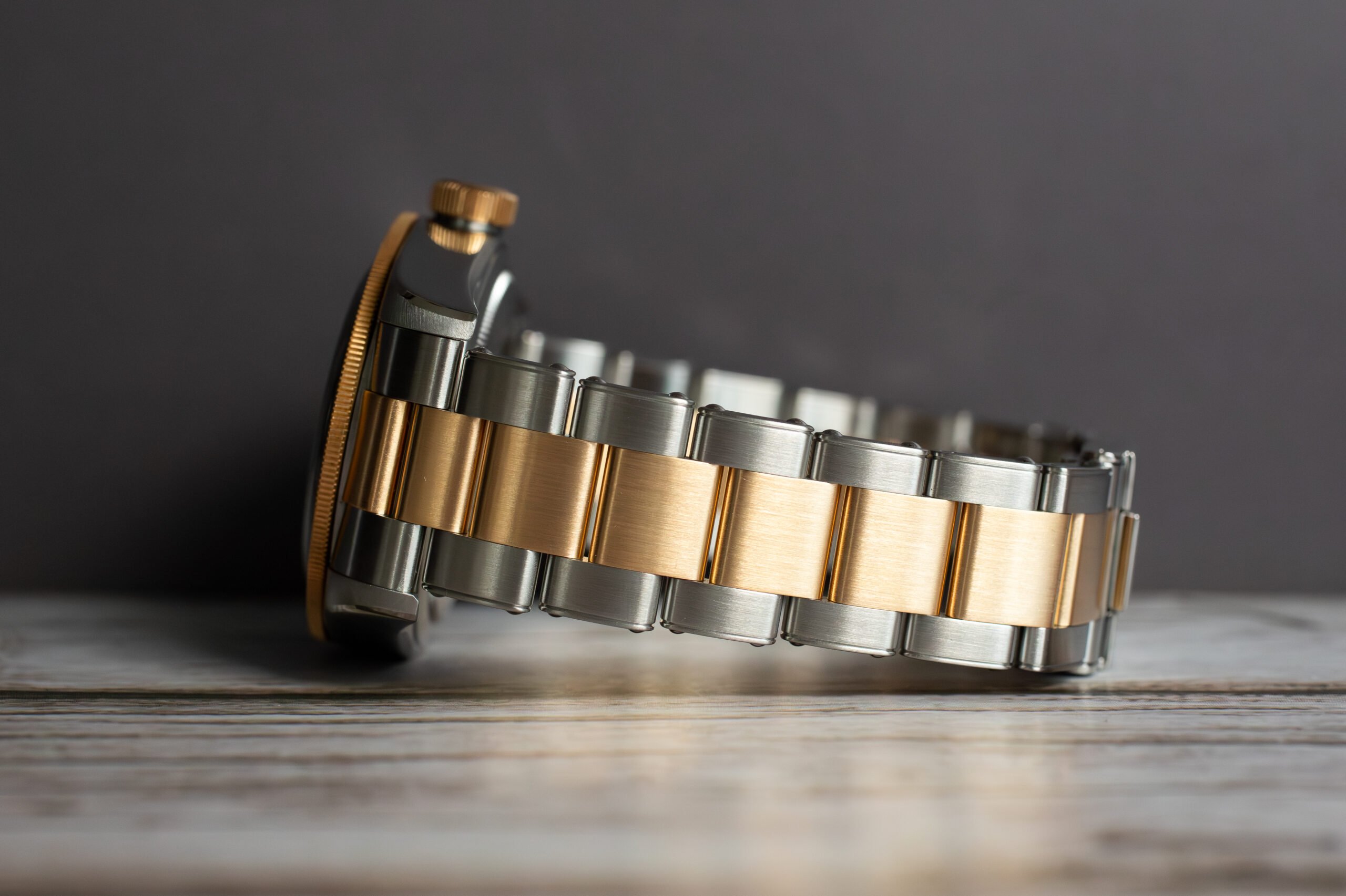 The distinctive bracelet features solid yellow gold centre links at 6 and 12 o’clock positions with remaining links in steel or gold-capped steel, creating sophisticated visual rhythm. The 200m water resistance maintains serious diving capability whilst the GMT functionality adds travel utility.