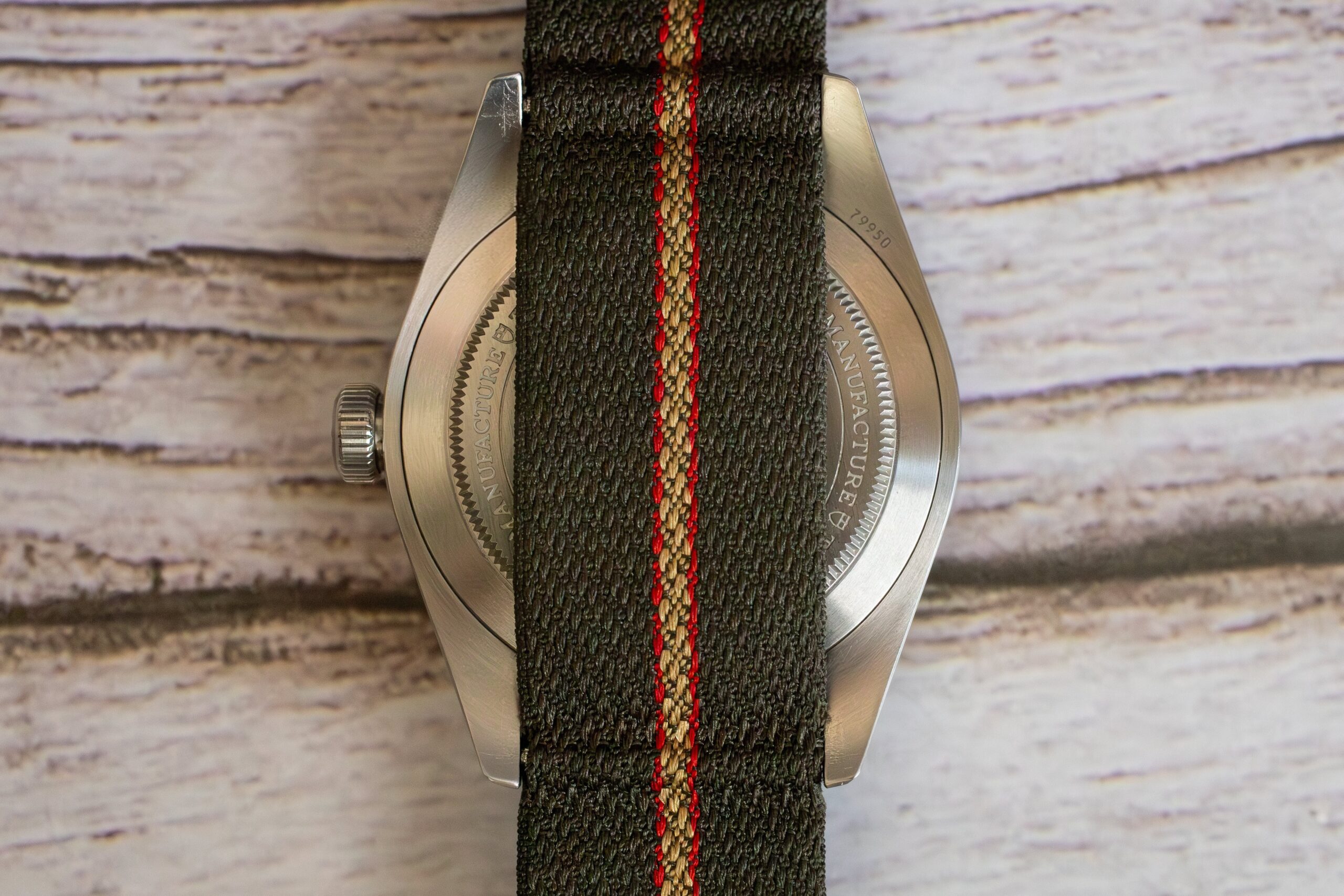 The green fabric strap with red and beige stripes references military expedition heritage whilst providing practical advantages including quick drying, lightweight construction, and comfort during extended outdoor wear. The Arabic numerals ensure rapid time reading in challenging conditions including low light and peripheral vision situations.