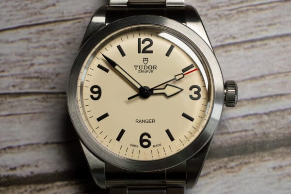 At 39mm with 12.0mm thickness, this provides optimal expedition watch proportions through fully brushed stainless steel construction that withstands extreme conditions whilst the matt beige dial with painted hour markers creates subtle contrast against the grained surface. The arrow-shaped hands with rounded hours and angular seconds maintain classic Ranger aesthetic character.