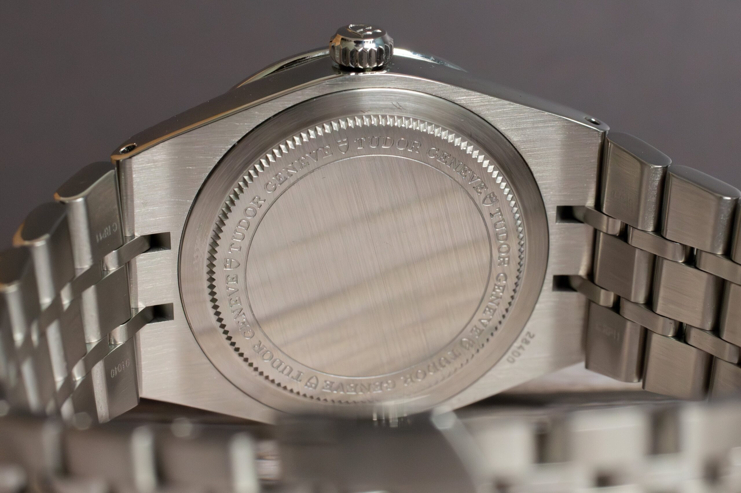 The scratch-resistant sapphire crystal ensures optimal clarity whilst the steel screw-down crown with TUDOR logo maintains water resistance integrity to 100 metres. The integrated bracelet construction creates seamless visual flow from case to strap.