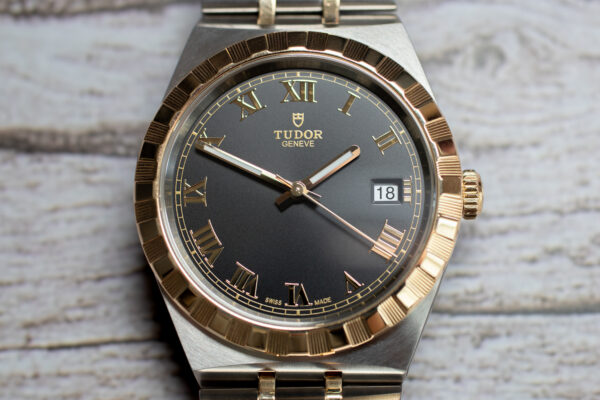 The TUDOR Royal S&G Black Dial 38mm (Ref. M28503-0006) applies precious metal refinement to TUDOR’s integrated bracelet sports watch formula whilst maintaining the practical versatility that makes the Royal collection appealing for daily wear. The notched yellow gold bezel and gold-capped centre links provide genuine precious metal content rather than simple plating, elevating this beyond standard steel sports watches.