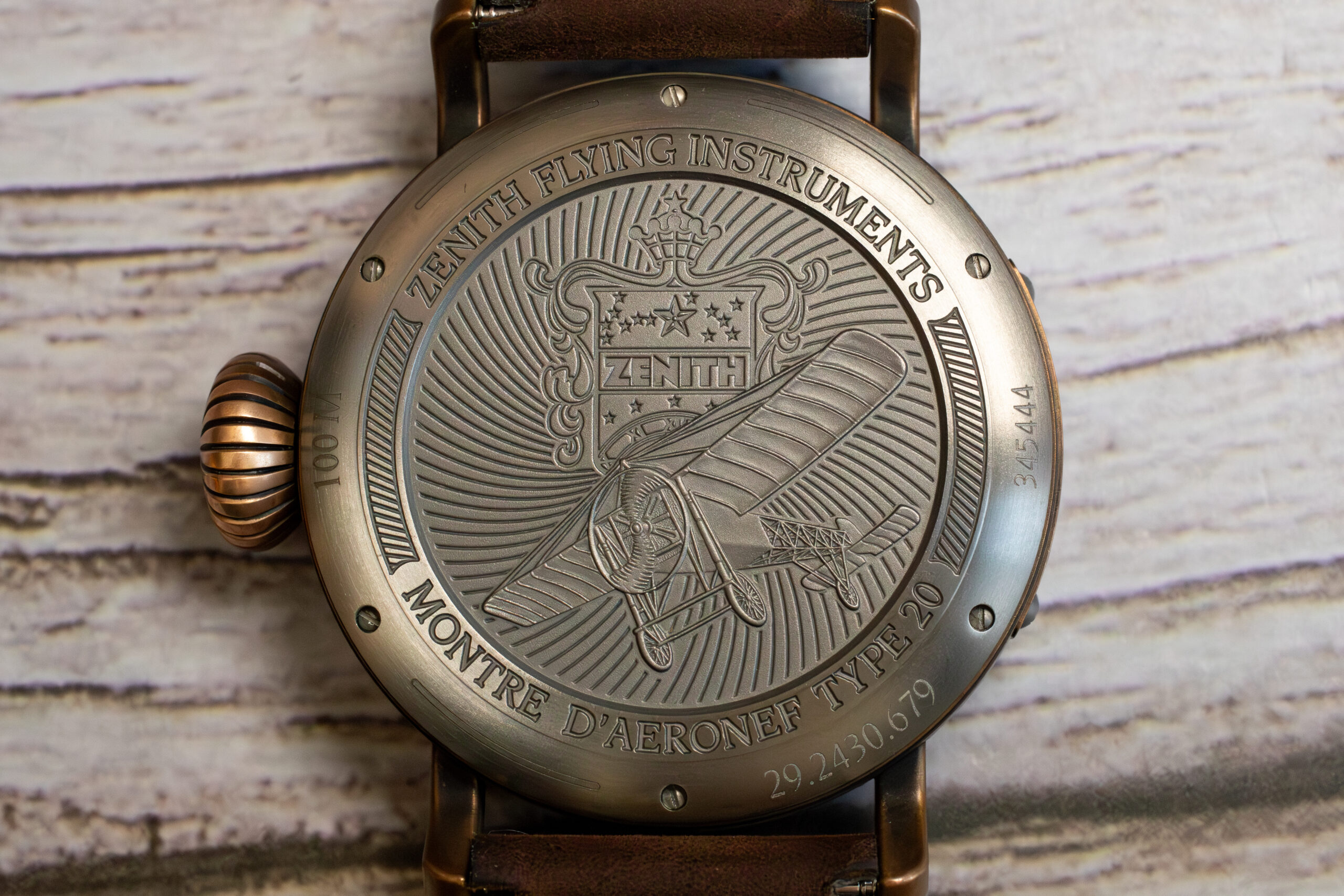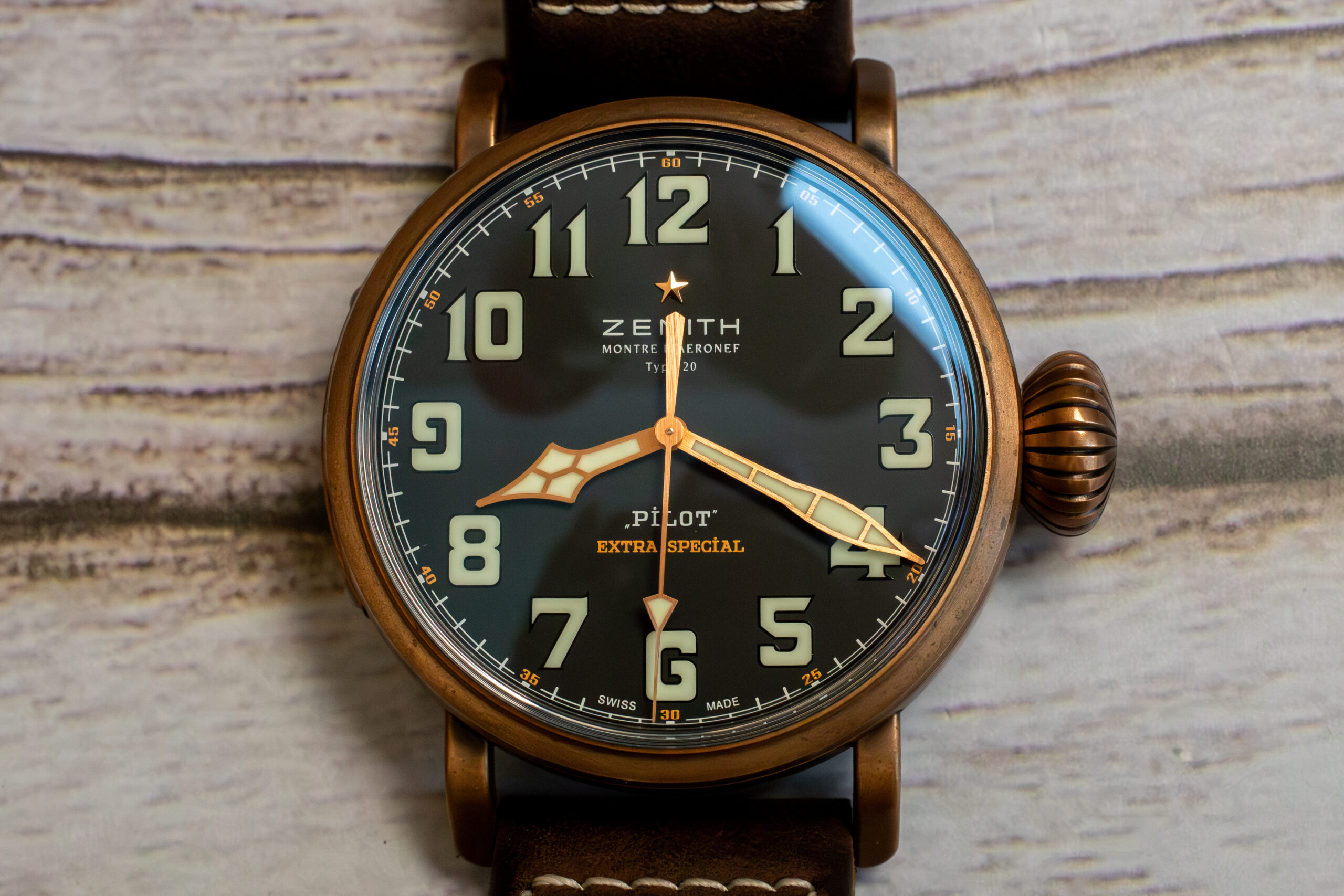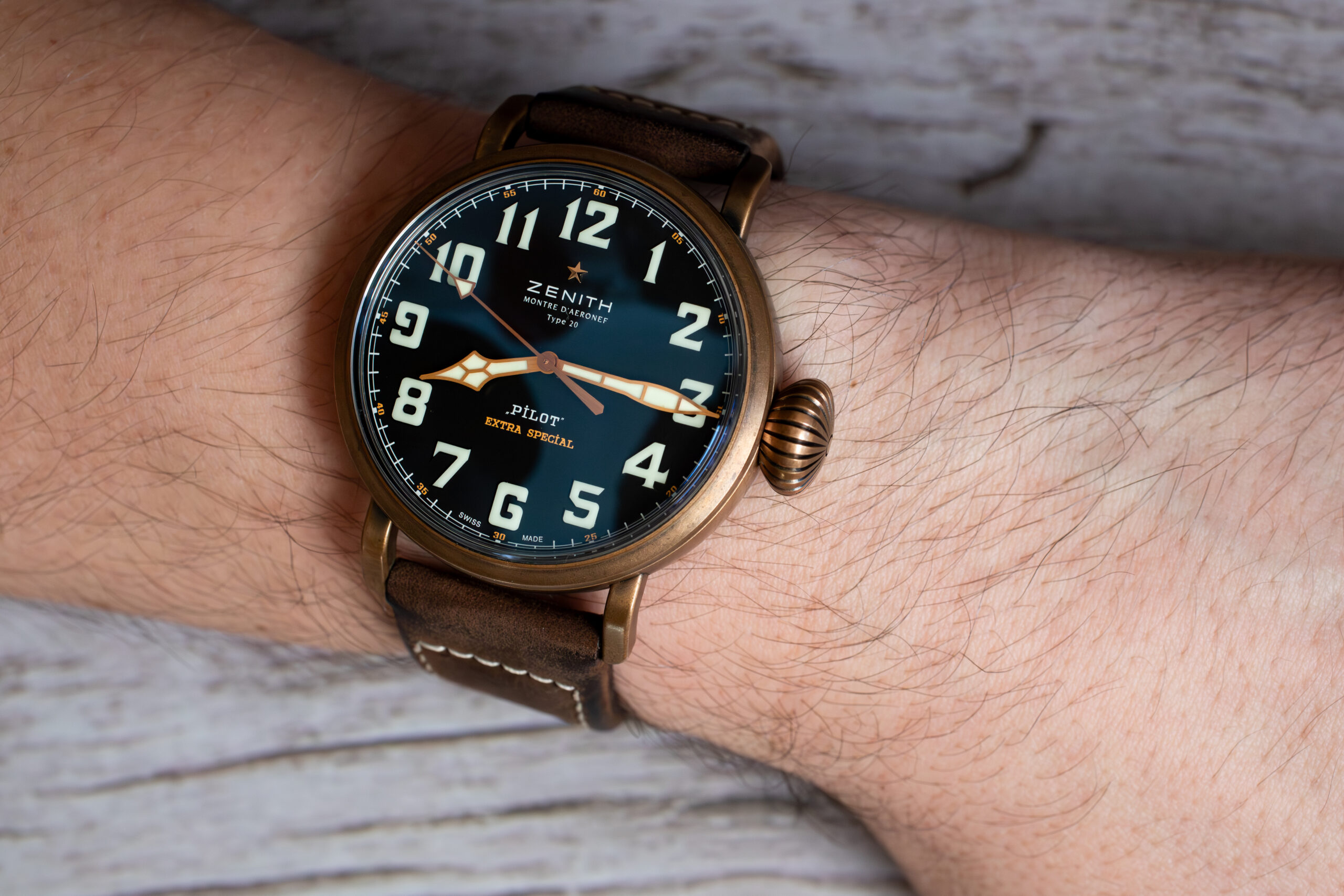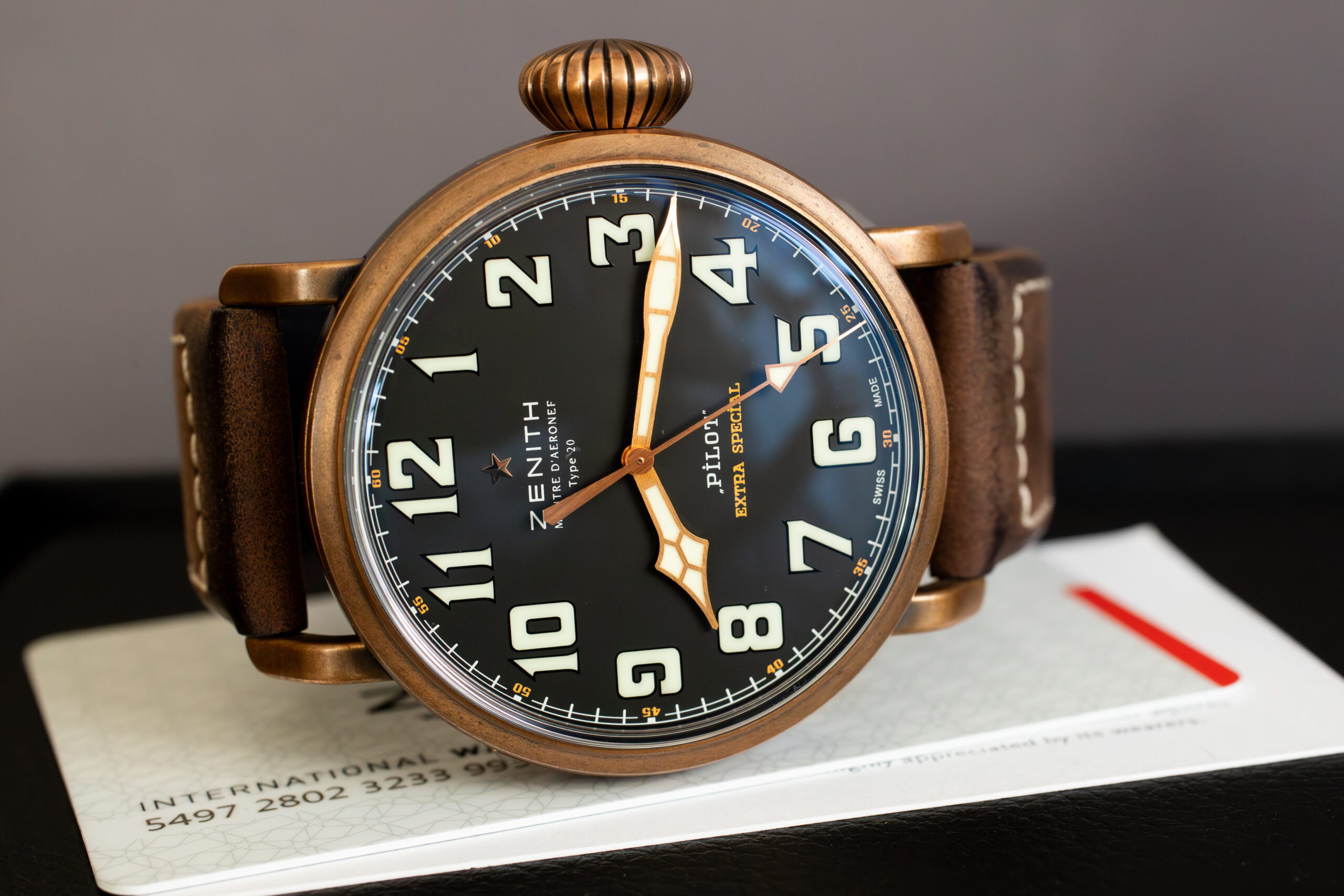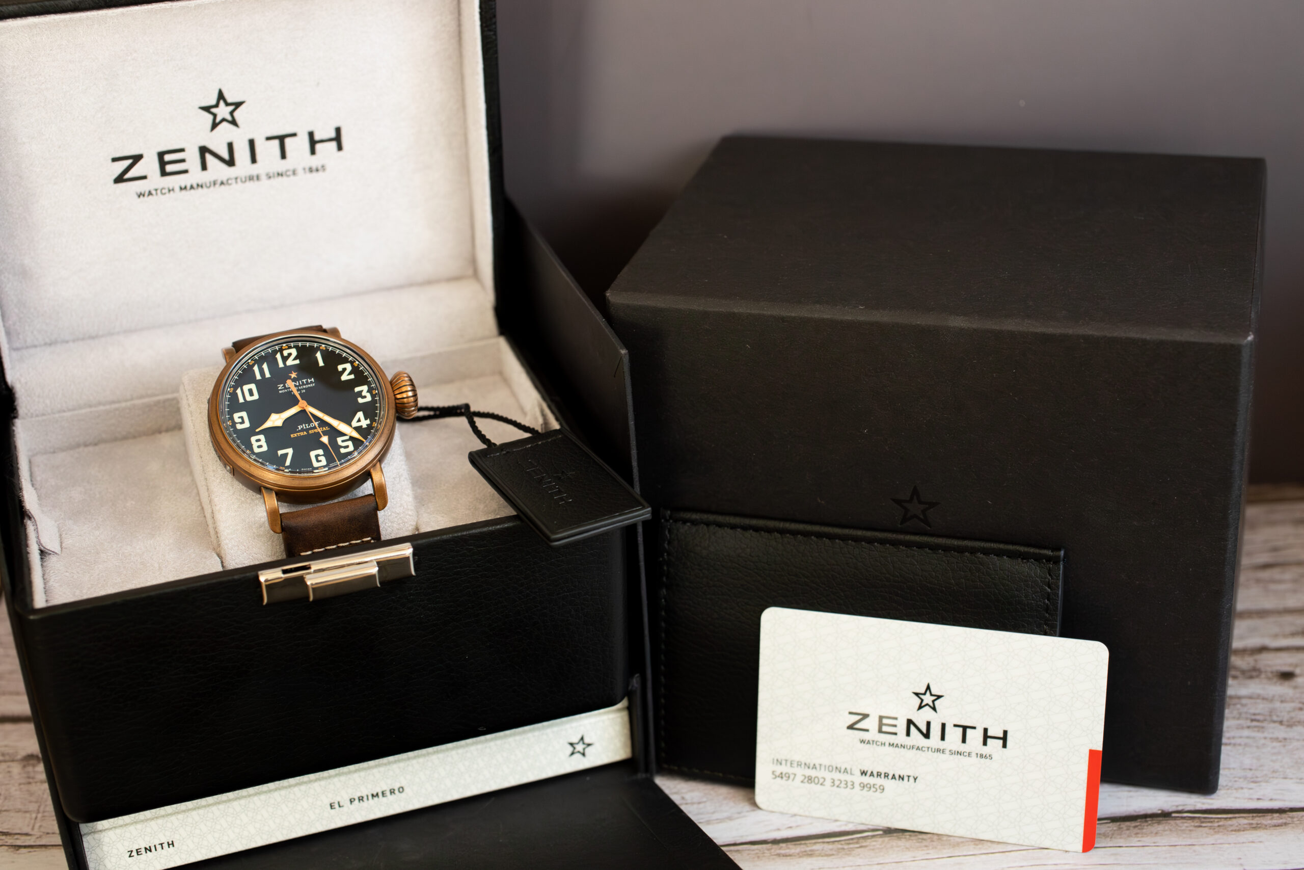The Zenith Pilot Type 20 Extra Special Bronze 45mm (Ref. 29.2430.679/21.C753) honours Zenith’s archetypal aviator heritage from aviation’s dawn through authentic pilot’s watch construction featuring oversized ‘onion’ crown for easy manipulation during flight operations. The bronze alloy case develops unique patina depending on wearer’s lifestyle, creating individual character whilst the matt black dial with Super-LumiNova C3 Arabic numerals ensures optimal cockpit legibility.