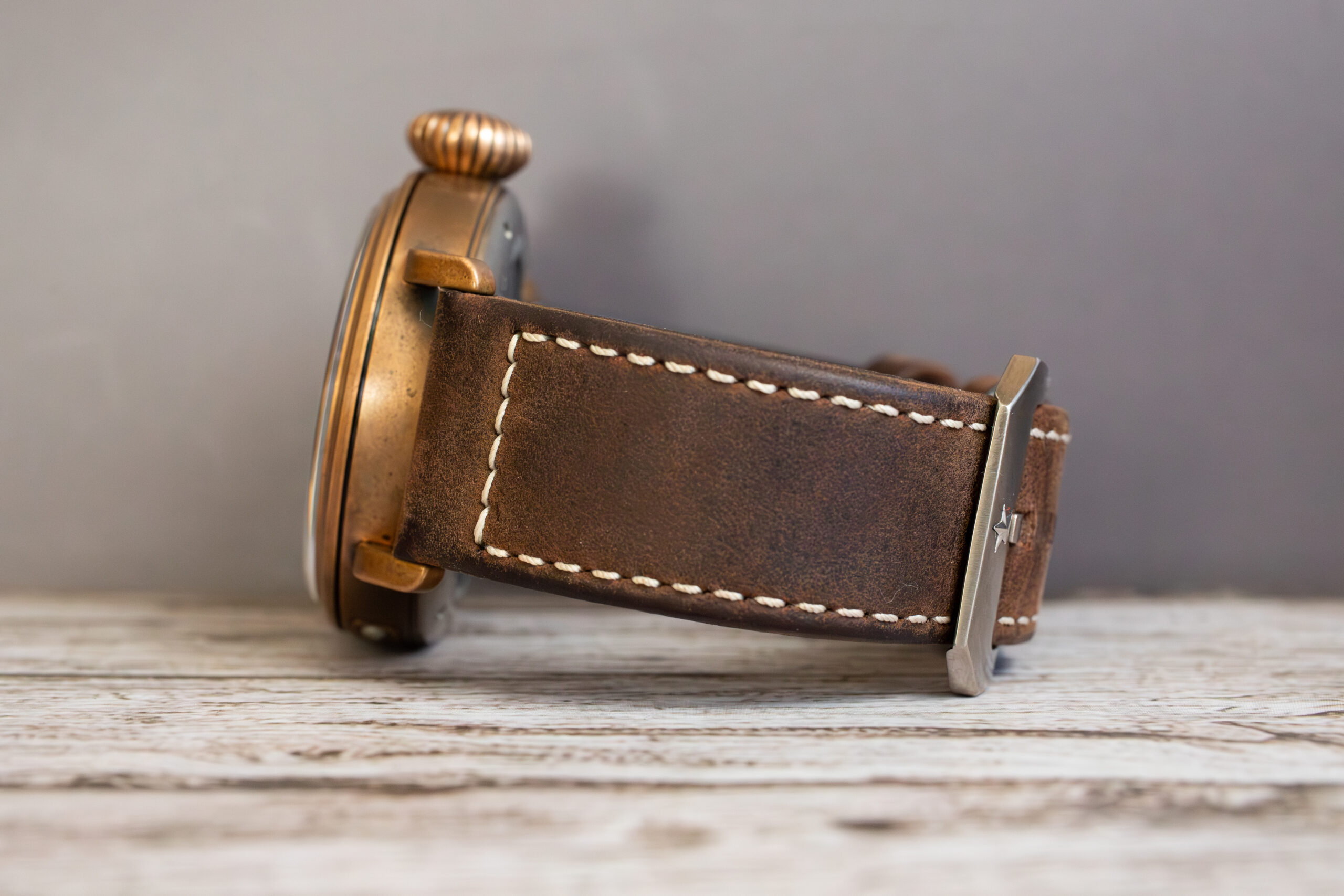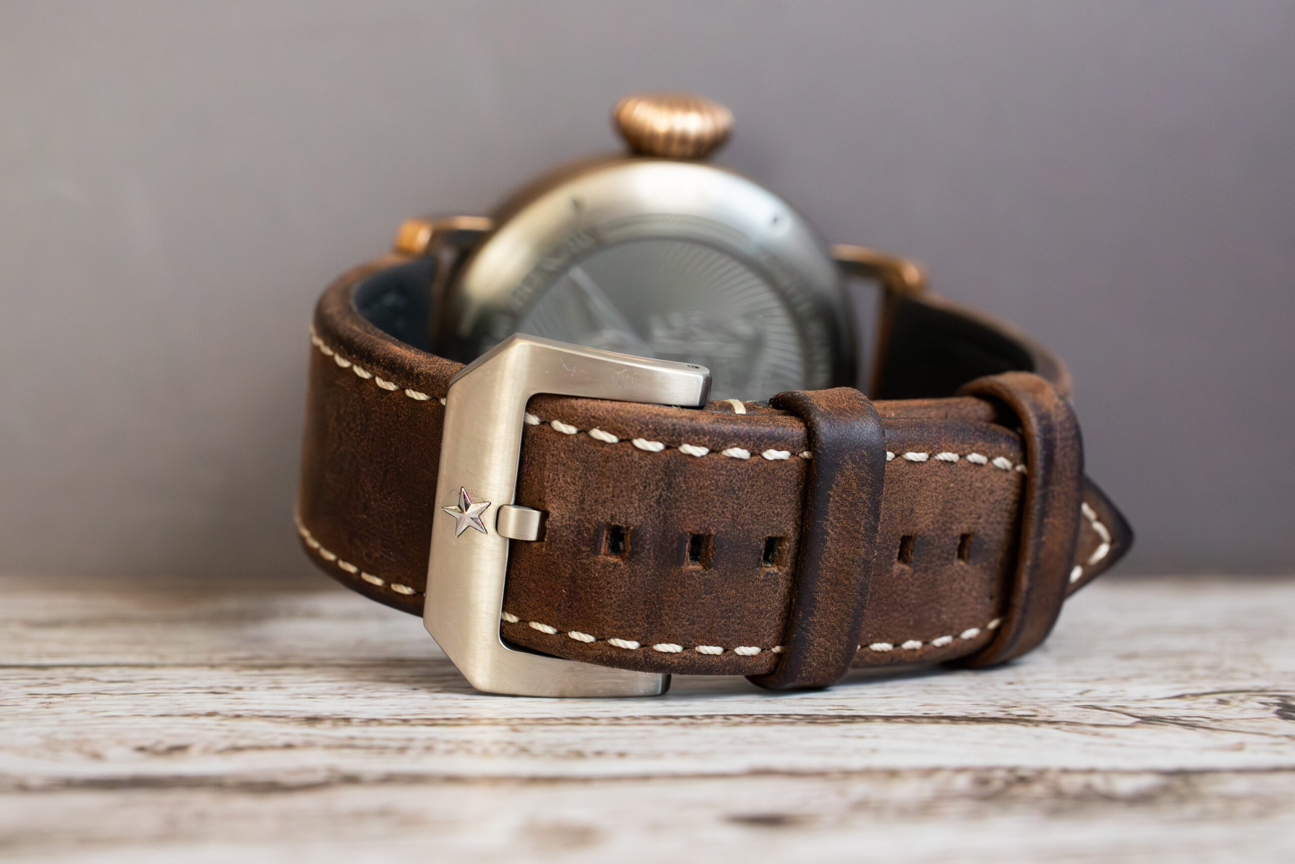 The scratch-resistant sapphire crystal with anti-glare coating ensures optimal visibility whilst the solid titanium caseback with miniature screws provides durability. The brown oily nubuck leather strap with protective rubber lining and titanium pin buckle creates authentic aviation aesthetic.