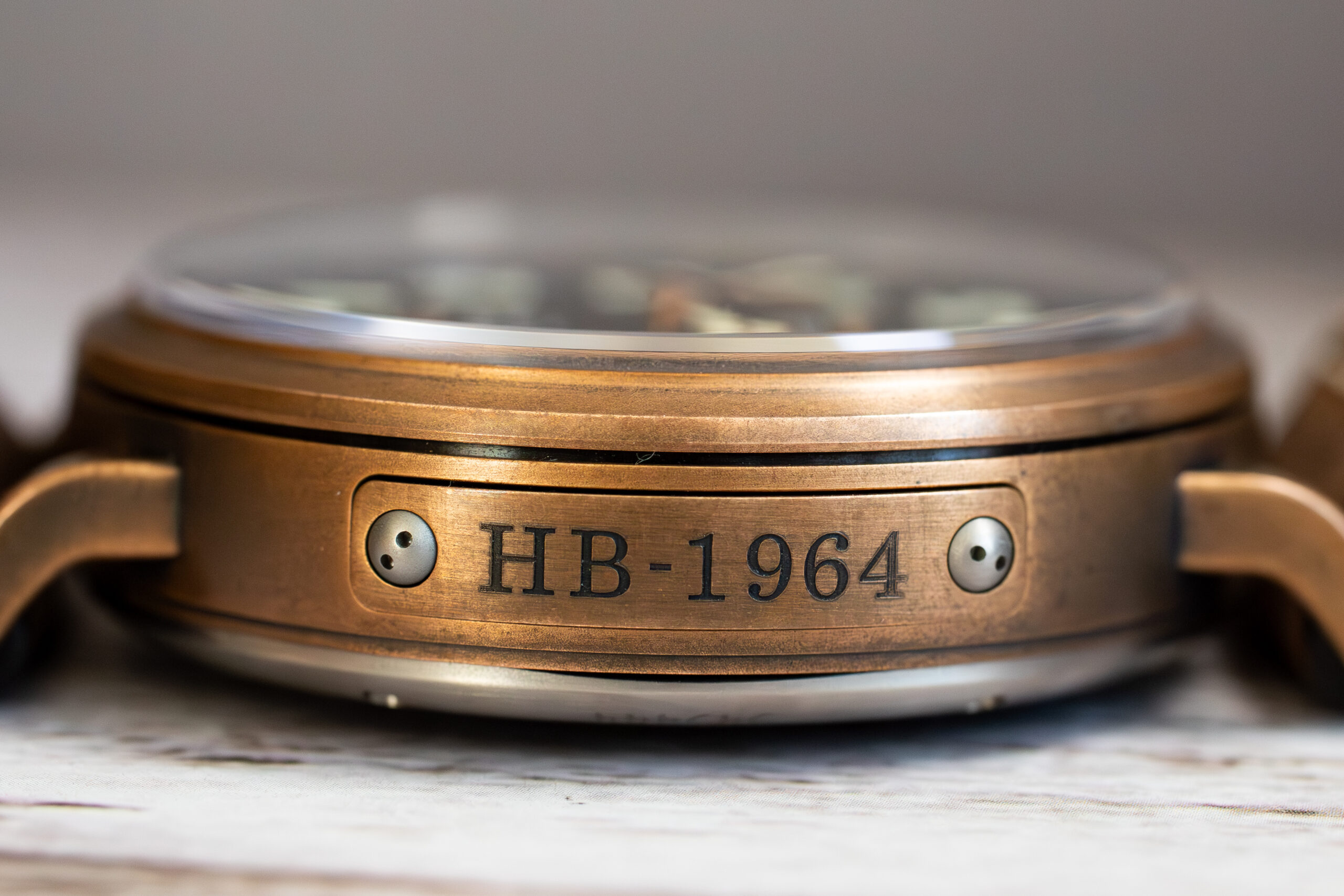 At 45mm with 14.25mm thickness, this provides substantial pilot’s watch presence through bronze construction that offers distinctive aging characteristics whilst the oversized crown enables gloved operation essential for aviation applications. The matt black dial with large gold-plated ‘cathedral’ hands creates optimal contrast whilst the Arabic numerals provide immediate time reading crucial for flight operations.